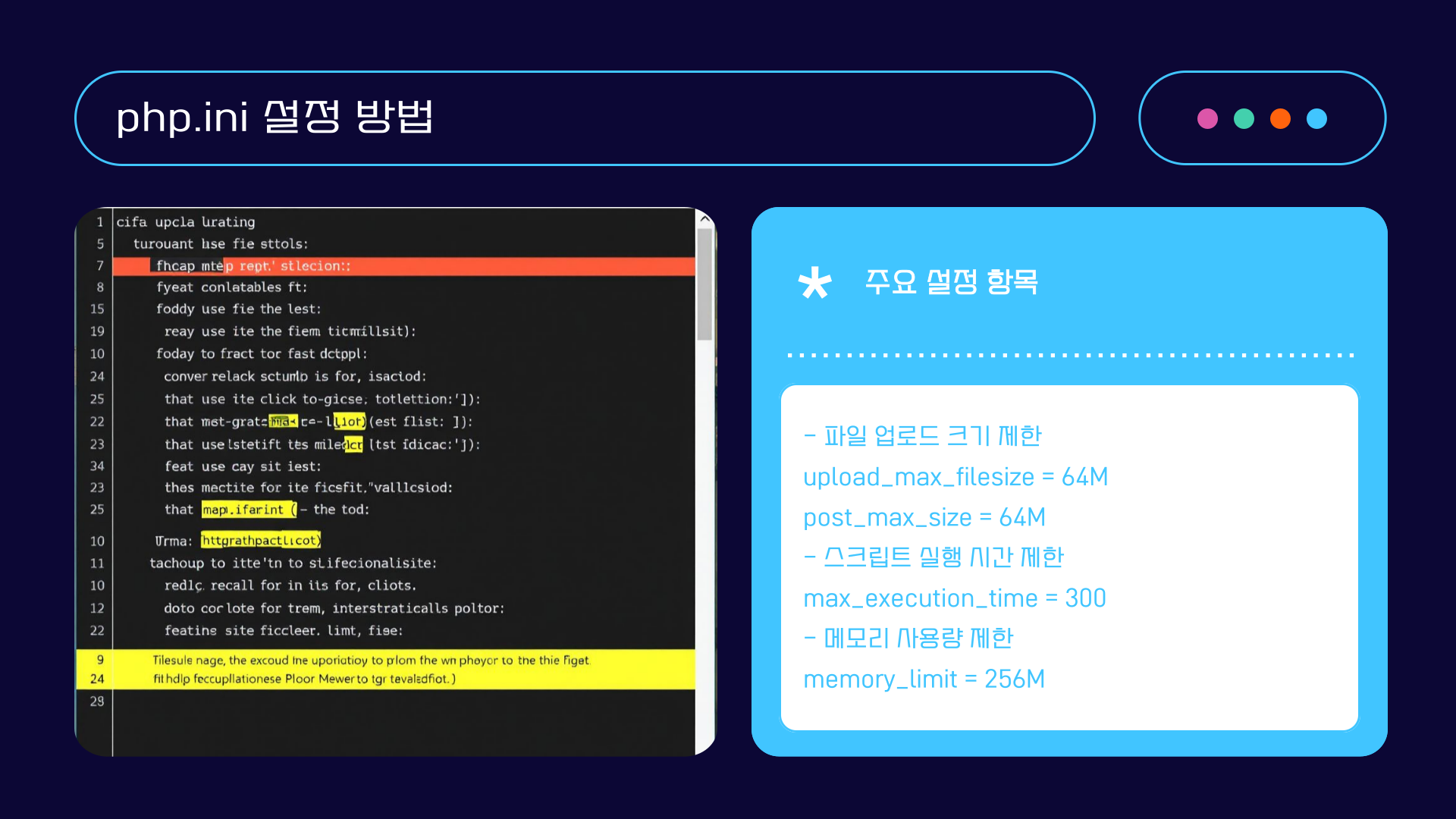 php.ini 파일은 PHP의 전반적인 동작을 제어합니다. 파일 업로드 크기, 실행 시간 제한, 메모리 사용량 등 다양한 설정을 수정할 수 있습니다.