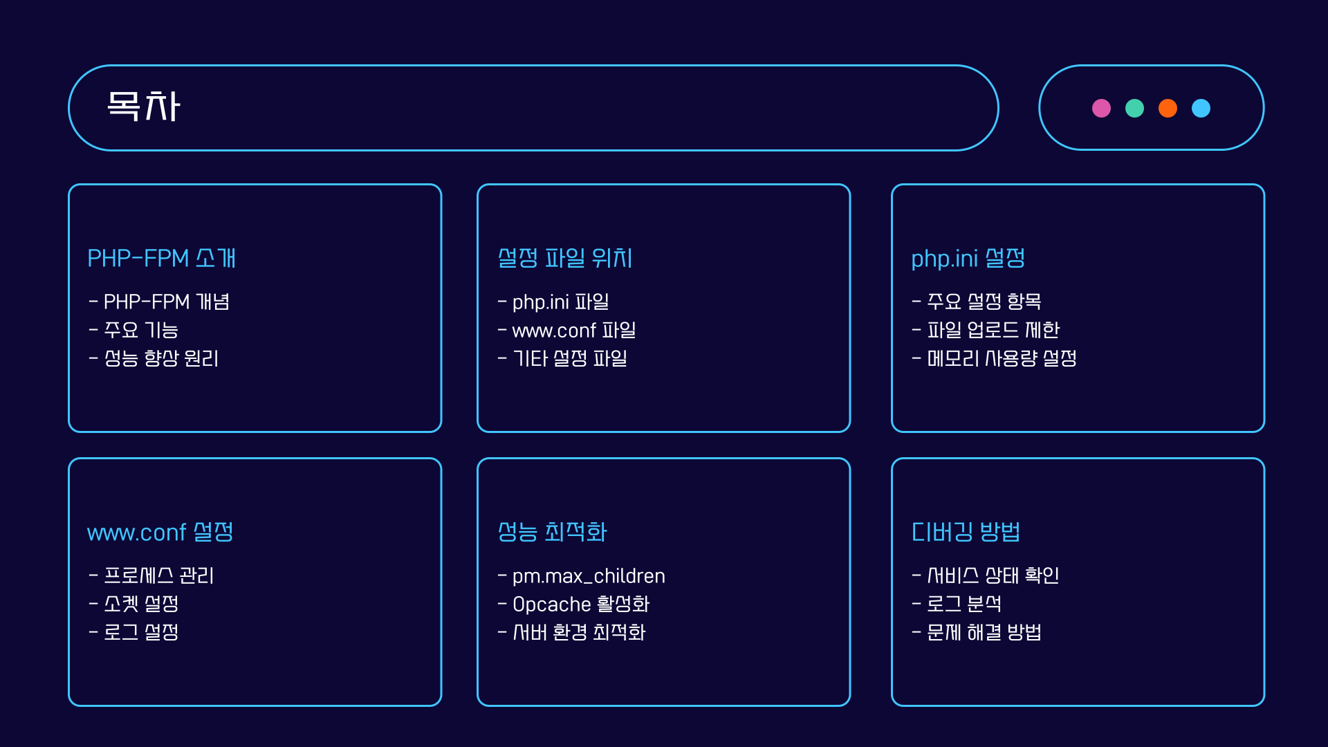 PHP-FPM(FastCGI Process Manager)은 PHP 기반 웹 애플리케이션의 성능을 극대화하는 중요한 도구입니다. 특히 Nginx와 함께 사용할 때 동적 콘텐츠를 처리하는 데 필수적인 역할을 합니다. 이번 글에서는 PHP-FPM 설정 파일의 주요 항목을 하나씩 살펴보고, 성능 최적화 및 문제 해결 방법까지 상세히 설명합니다.